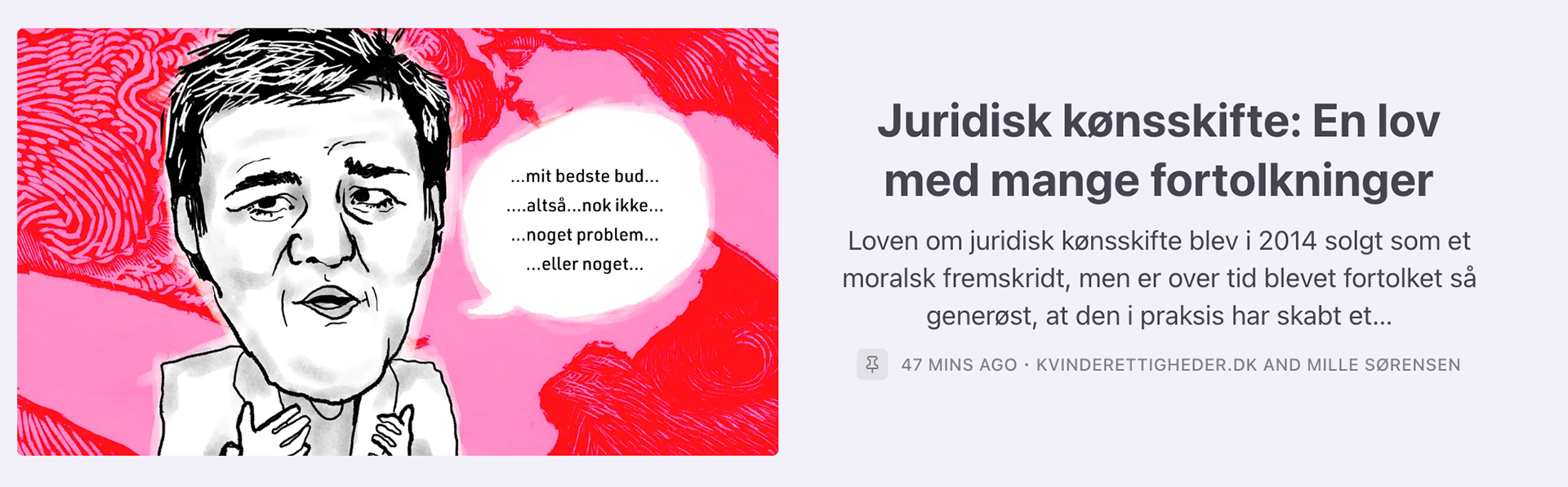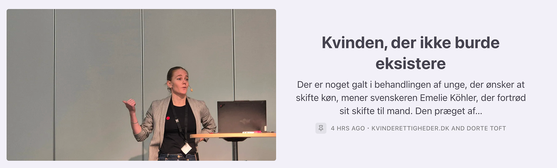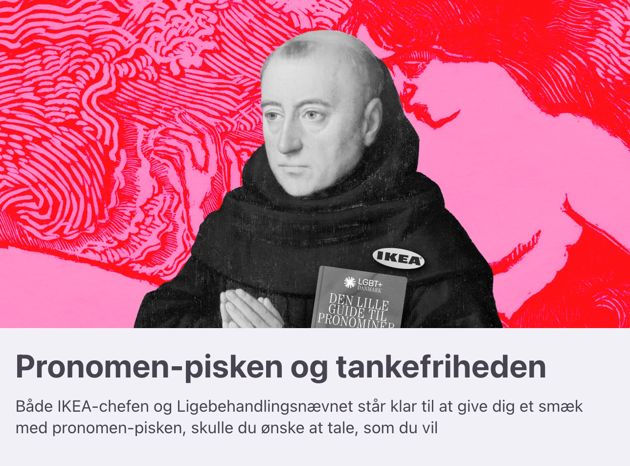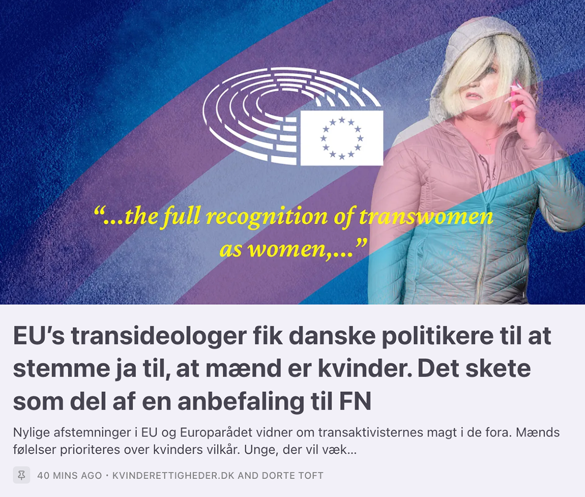 ...... Myndigheder, arbejdsgivere, organisationer og lign. pådutter borgere at deltage aktivt i en ideologisk overbevisning om at et menneske har skiftet køn ved at forvente eller kræve, at man skal omtale en mand som en "hun" og "hende", fordi vedkommende identificerer sig som kvinde, og således krænker borgernes ret til tanke-, ytrings- og religionsfrihed